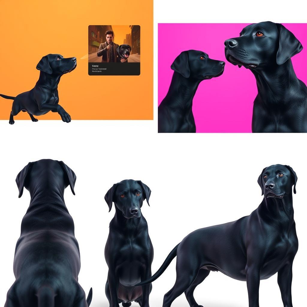La force de ce générateur, c’est sa polyvalence. Un exemple marquant serait la création d’un modèle 3D d’un labrador noir, illustré sous différents angles, avec même une capture d’écran de ce personnage dans un style de jeu vidéo 2D. De quoi faire rougir d’envie n’importe quel designer !